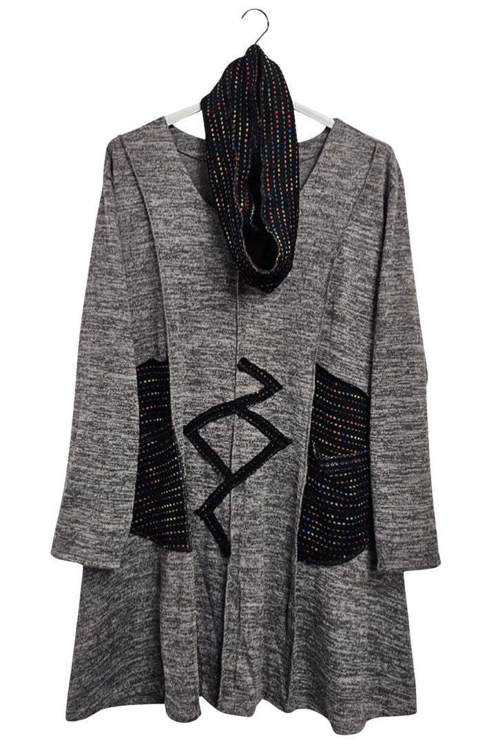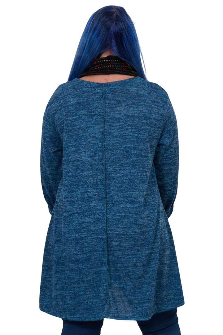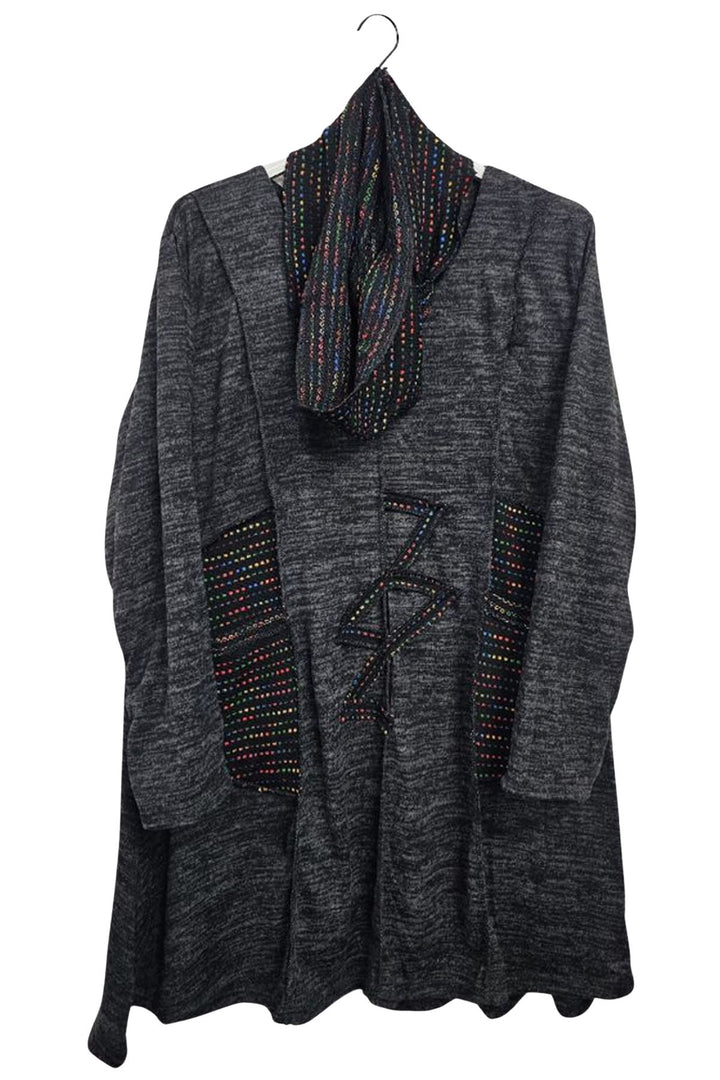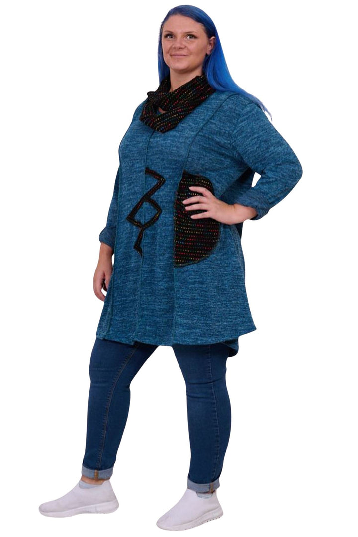 Elevate your casual autumn and winter wardrobe with this stunning Italian viscose top. Featuring a vibrant coloured zigzag pattern, this top brings playful energy to your look. The round neck and long sleeves provide warmth and comfort during cooler seasons, while the loose fit ensures plus-size figures feel relaxed and stylish. Front pockets add both practicality and charm, making it perfect for everyday wear. This top comes with a matching scarf, creating a coordinated, effortless style. Made for comfort and versatility, this piece is ideal for layering, bringing together style and functionality for the modern, casual woman.