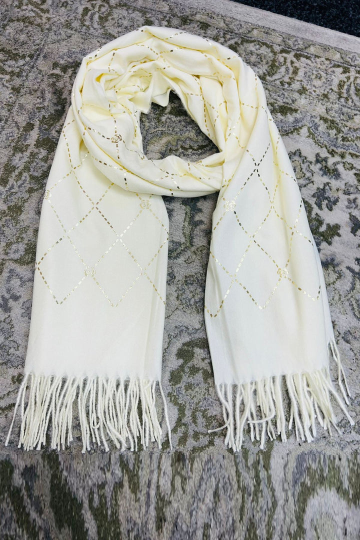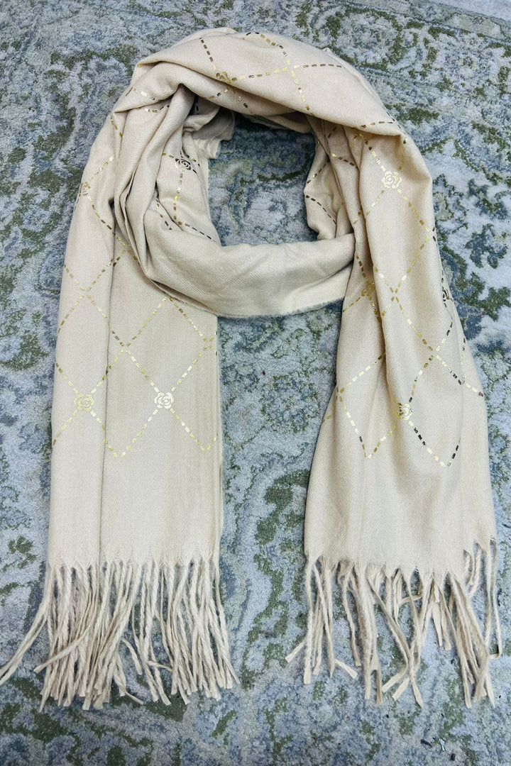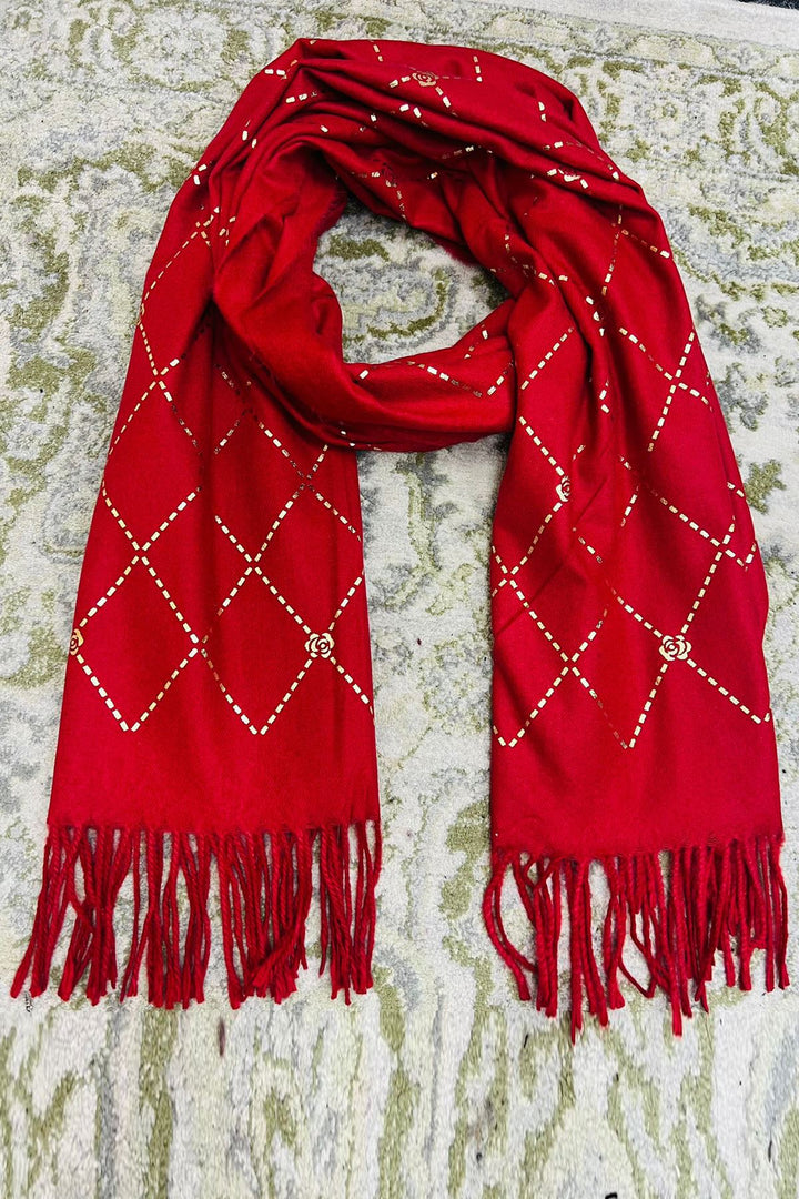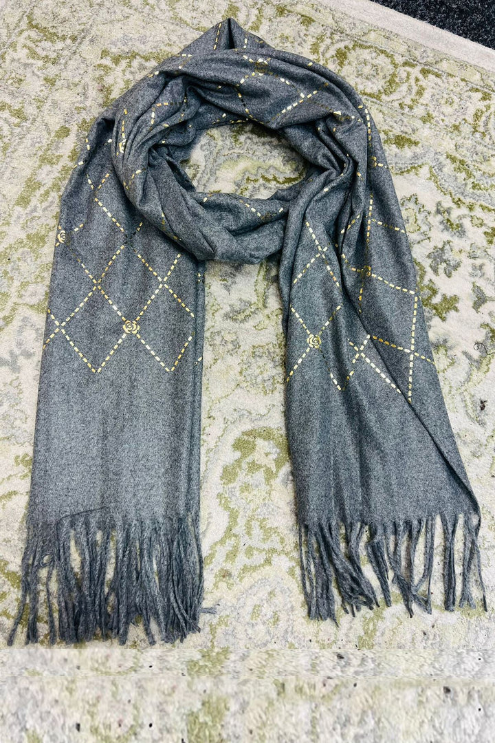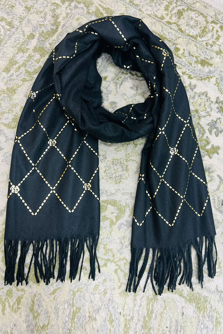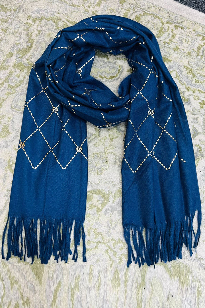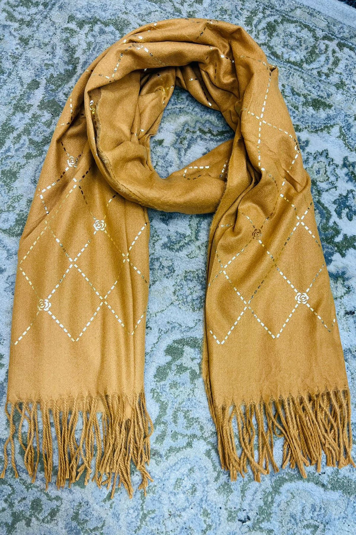 Wrap yourself in elegance and warmth with this beautifully crafted olive green winter scarf, featuring a sophisticated gold foil diamond pattern accented with floral motifs. Made from soft, breathable fabric, this scarf offers both style and comfort for the colder months. The tasseled ends add a touch of boho charm, making it suitable for everyday wear or special outings. Whether draped over the shoulders or wrapped snugly around the neck, this scarf brings a refined finish to any winter ensemble.