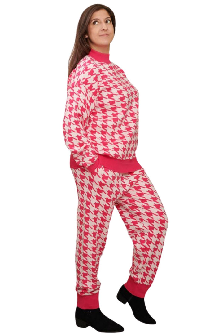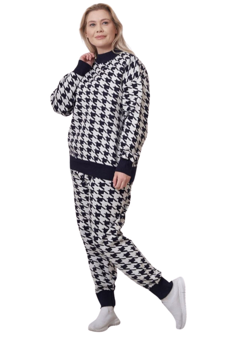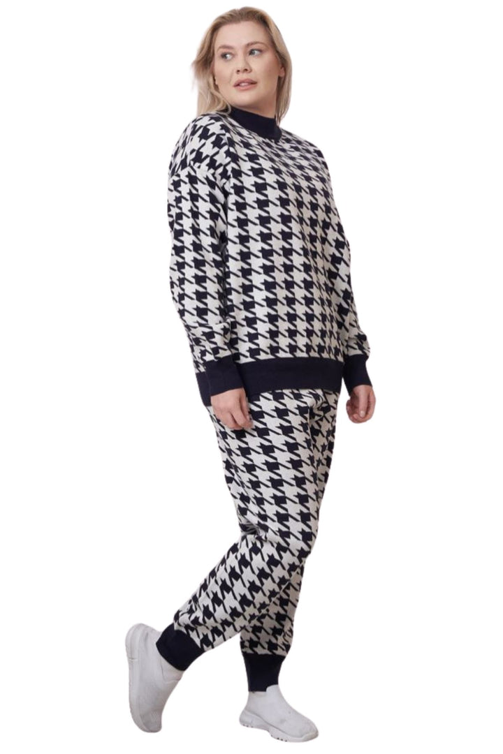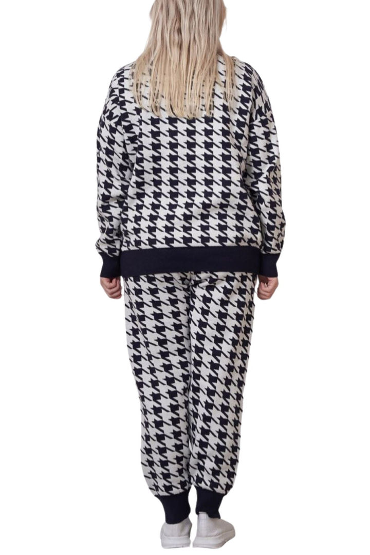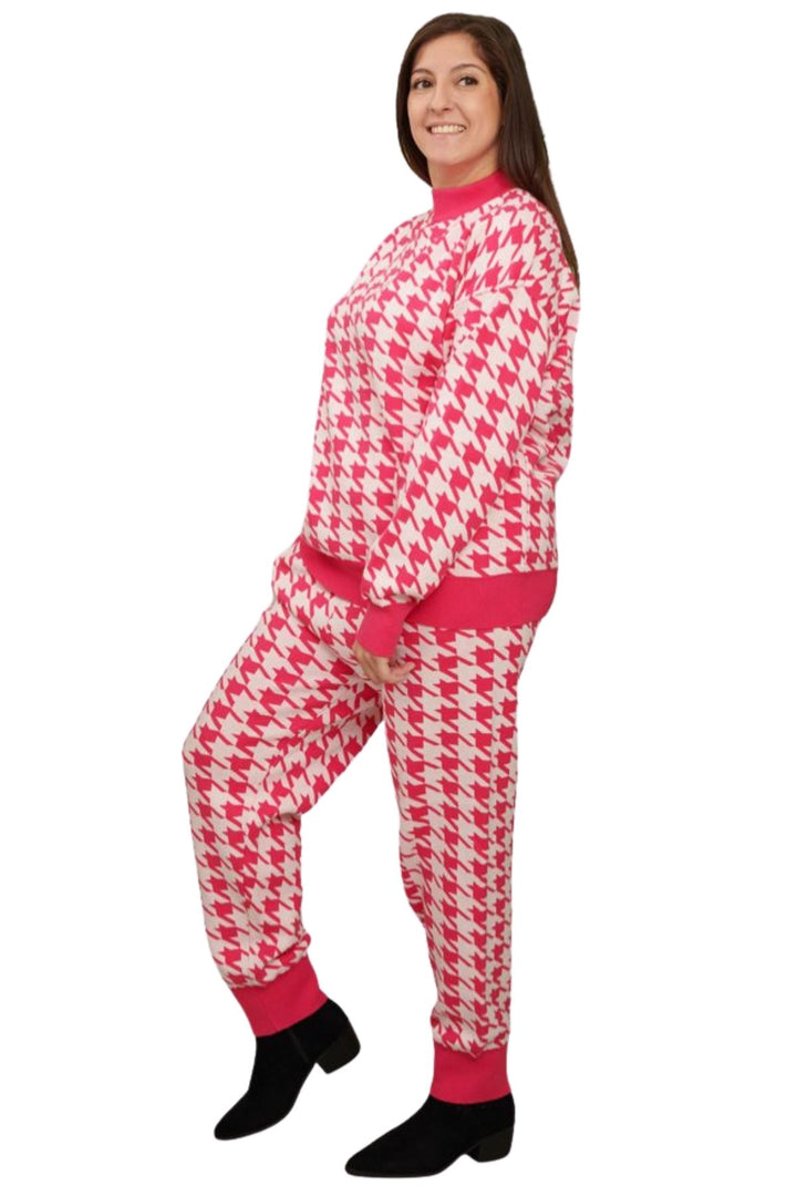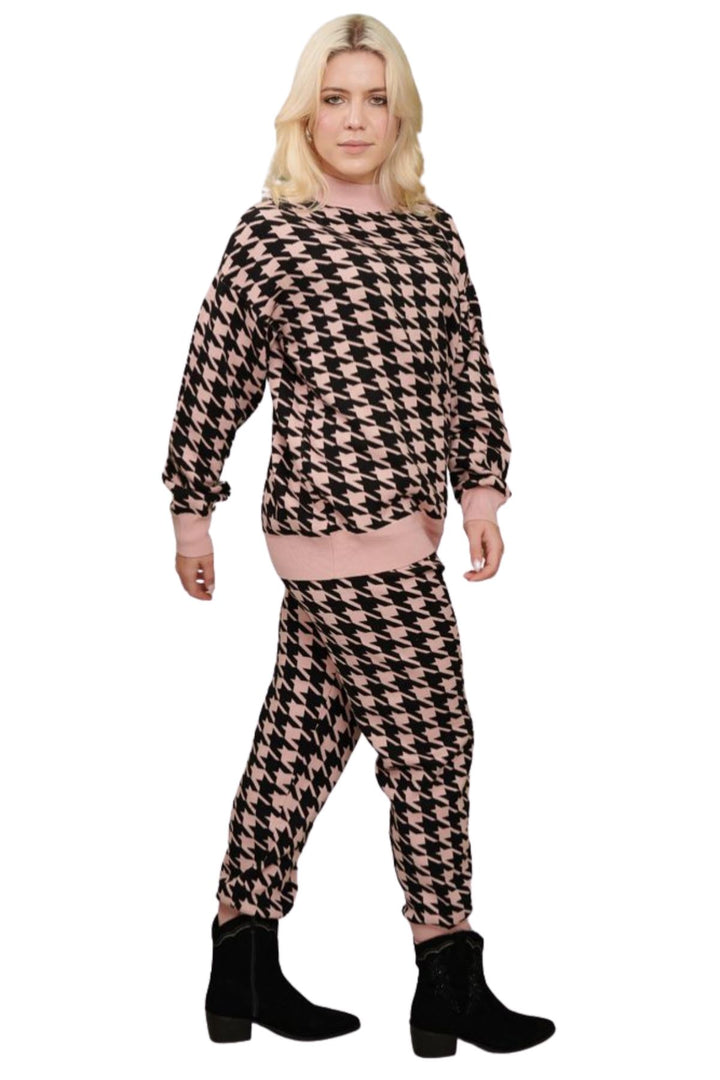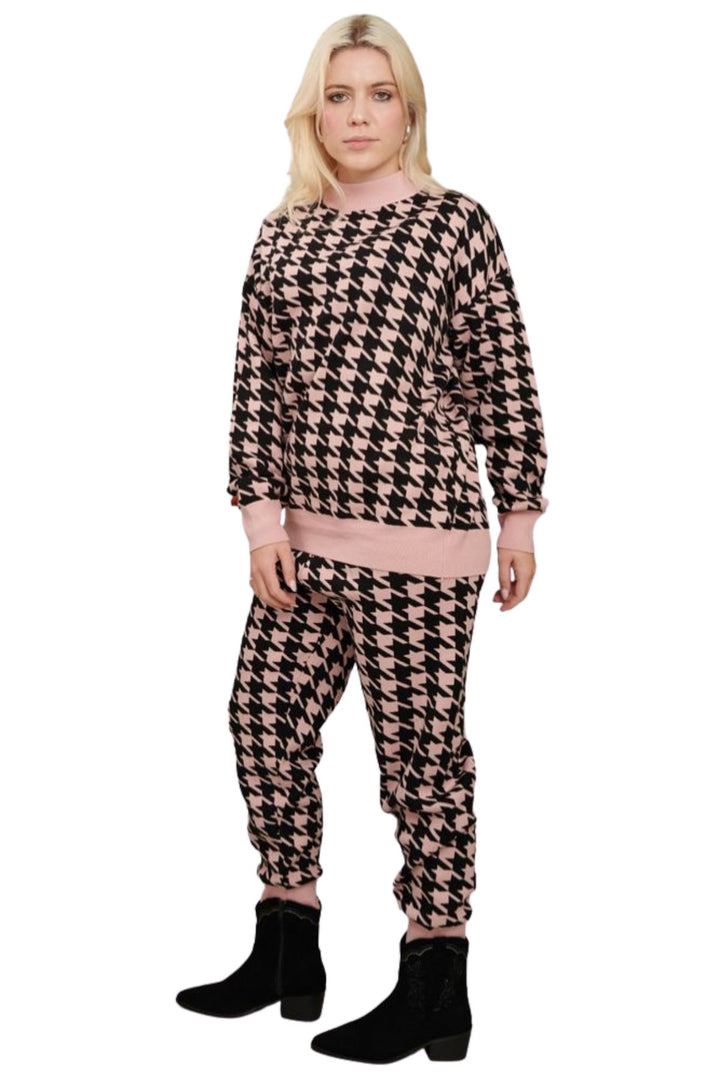 Elevate your autumn-winter style with our cozy Viscose Dog Tooth Pattern Co-Ord set for plus-size women. Featuring a round neck, long sleeves, and a loose fit, this knitted ensemble ensures comfort and fashion effortlessly. Complete with an elasticated waistband and cuffed hem, it's perfect for casual occasions.