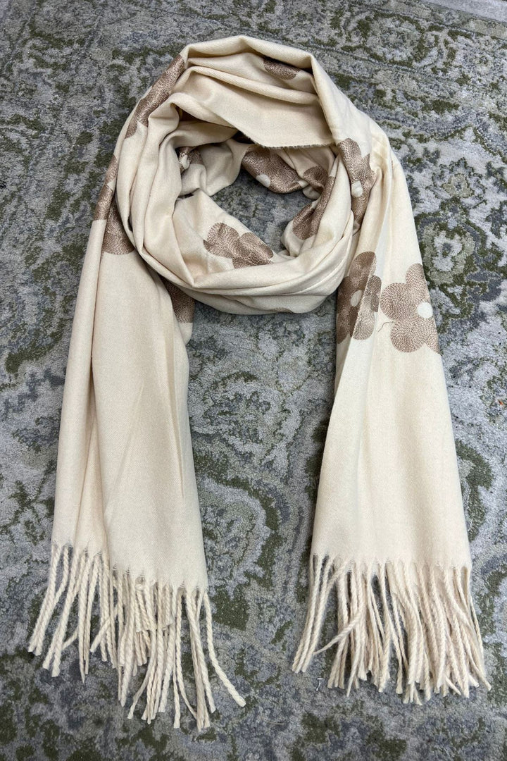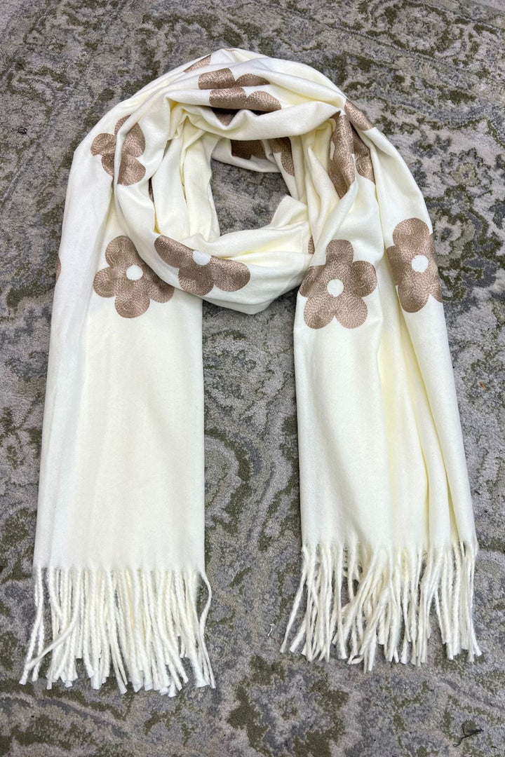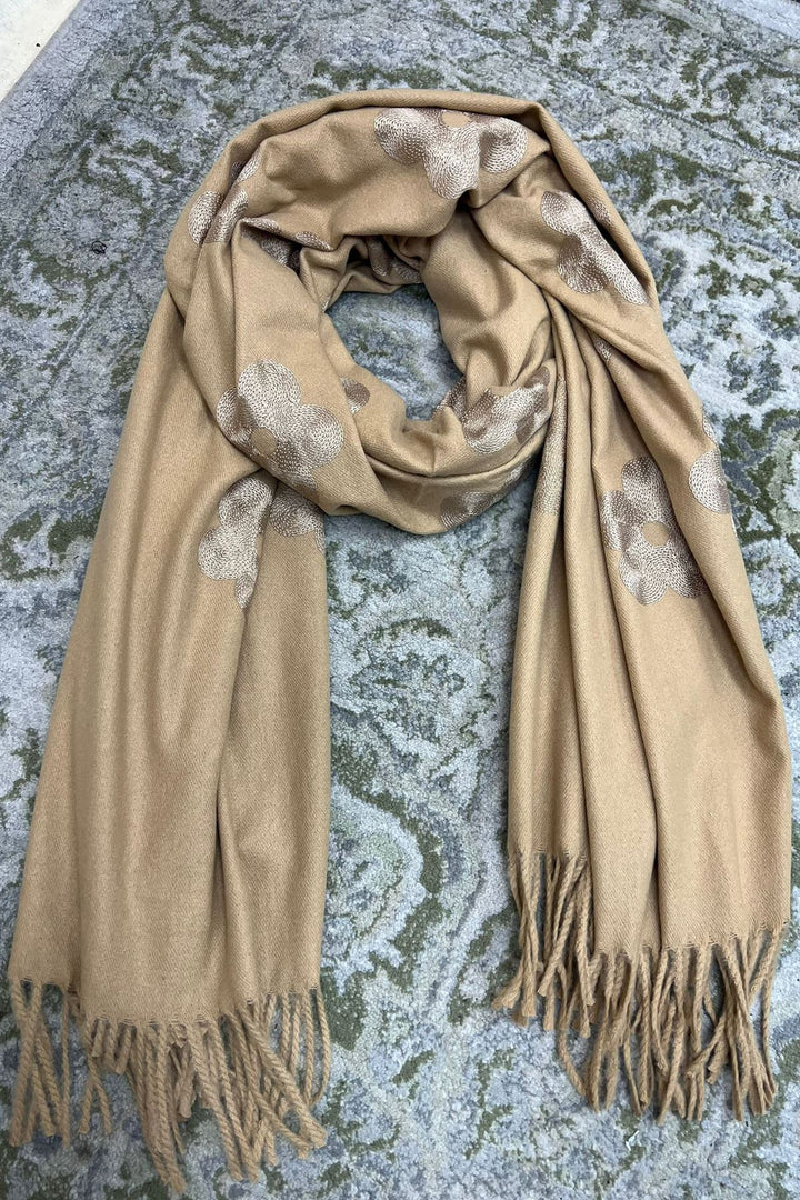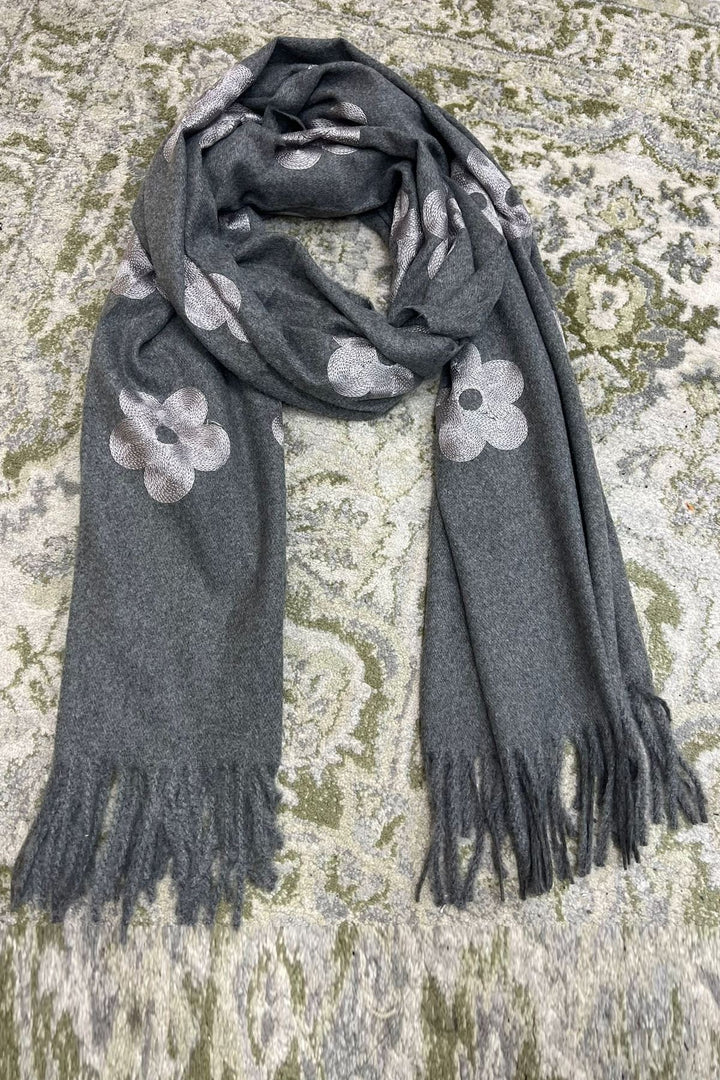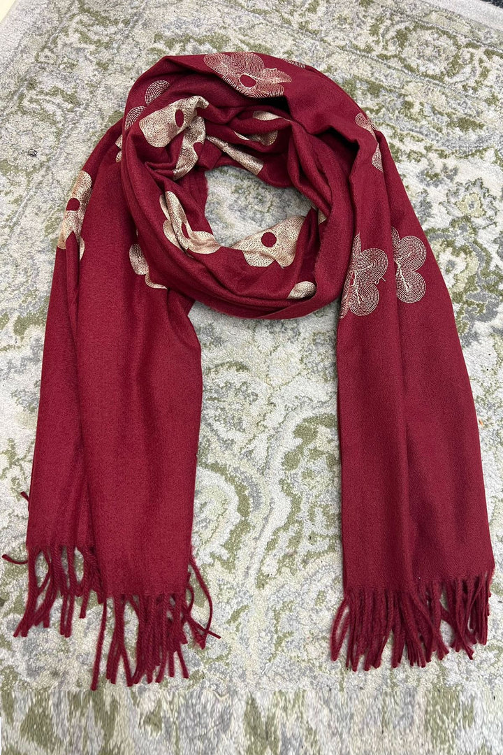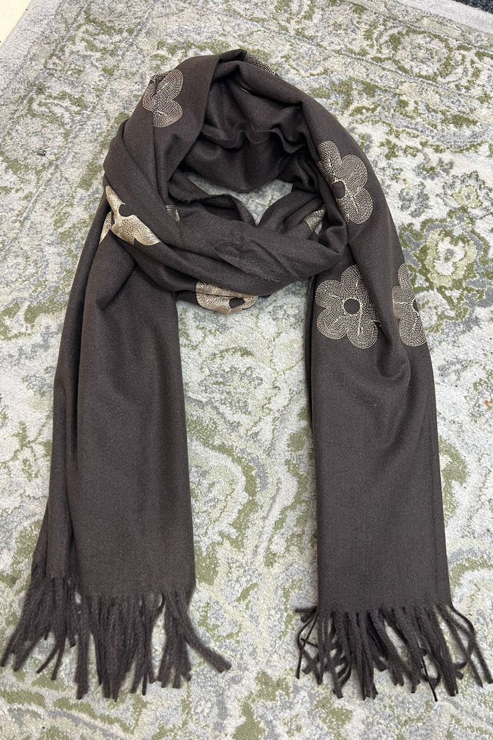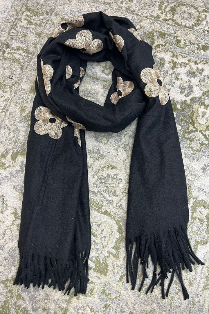 Add a sophisticated touch to your winter wardrobe with this beautifully crafted black scarf featuring luxurious metallic floral embroidery. Designed with a soft, warm texture and elegant tassel fringe on both ends, this scarf is the perfect accessory for both casual and formal wear. The standout gold-thread floral pattern adds a unique flair, while the generous length allows for versatile styling—drape, wrap, or knot it as you please. Whether you're heading out for a holiday event or layering up for chilly days, this scarf delivers both comfort and fashion-forward appeal. A timeless piece that brings elegance and warmth to every outfit.