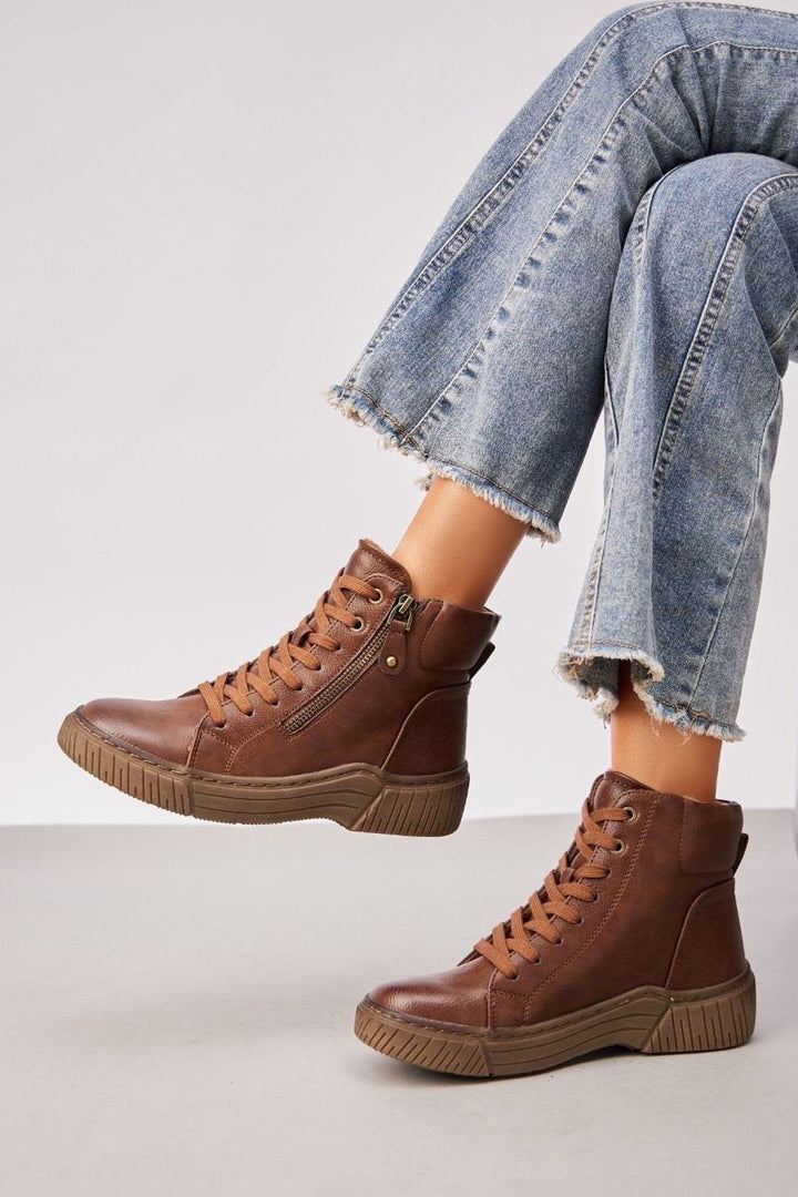 Step out in style with these women’s burgundy high-top sneakers — the perfect fusion of casual comfort and street-smart fashion. Crafted from soft faux leather, these sneakers feature a sleek lace-up front with a functional side zipper for easy on and off. The cushioned interior lining ensures comfort throughout the day, while the durable rubber sole provides reliable grip and support. Designed in a rich burgundy shade with subtle stitching details, these sneakers effortlessly complement jeans, joggers, or casual dresses. Ideal for autumn and winter wear, they offer both warmth and versatility. Whether for weekend outings, travel, or everyday errands, these high-top trainers deliver a chic, sporty edge to your look.
