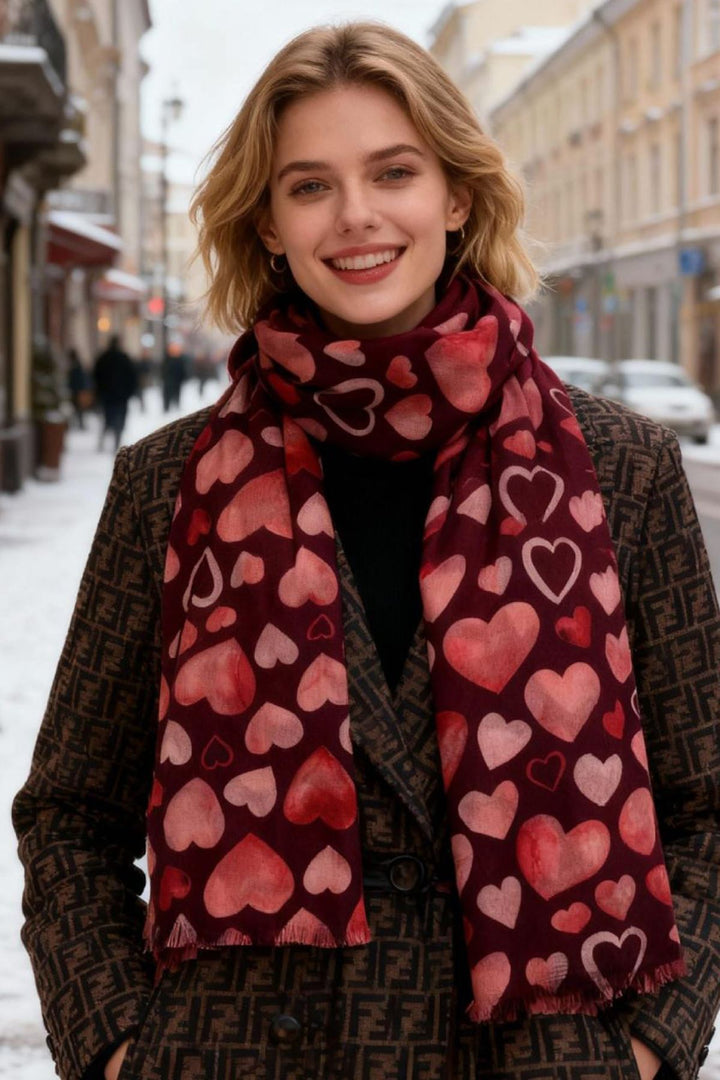 Add warmth and romance to your winter wardrobe with this Women’s Burgundy Heart Print Winter Scarf. Designed with a charming mix of pink and red heart motifs on a deep burgundy background, this scarf perfectly balances cozy comfort with playful elegance. Made from ultra-soft, lightweight fabric, it keeps you snug on cold days while adding a touch of love-inspired charm to any outfit. Ideal for both casual and dressy occasions, this scarf makes a lovely winter accessory or a thoughtful Valentine’s Day gift for someone special.