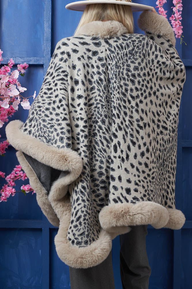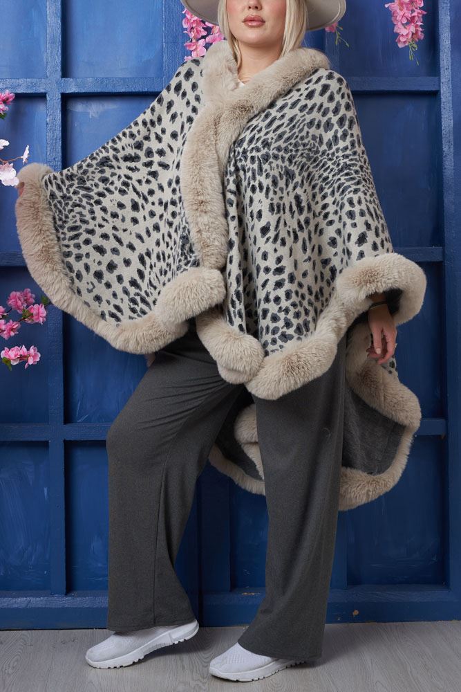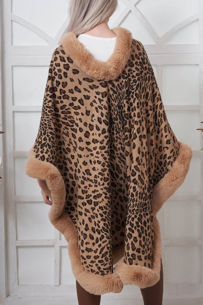 Leopard Print Faux Fur Batwing Sleeve Poncho