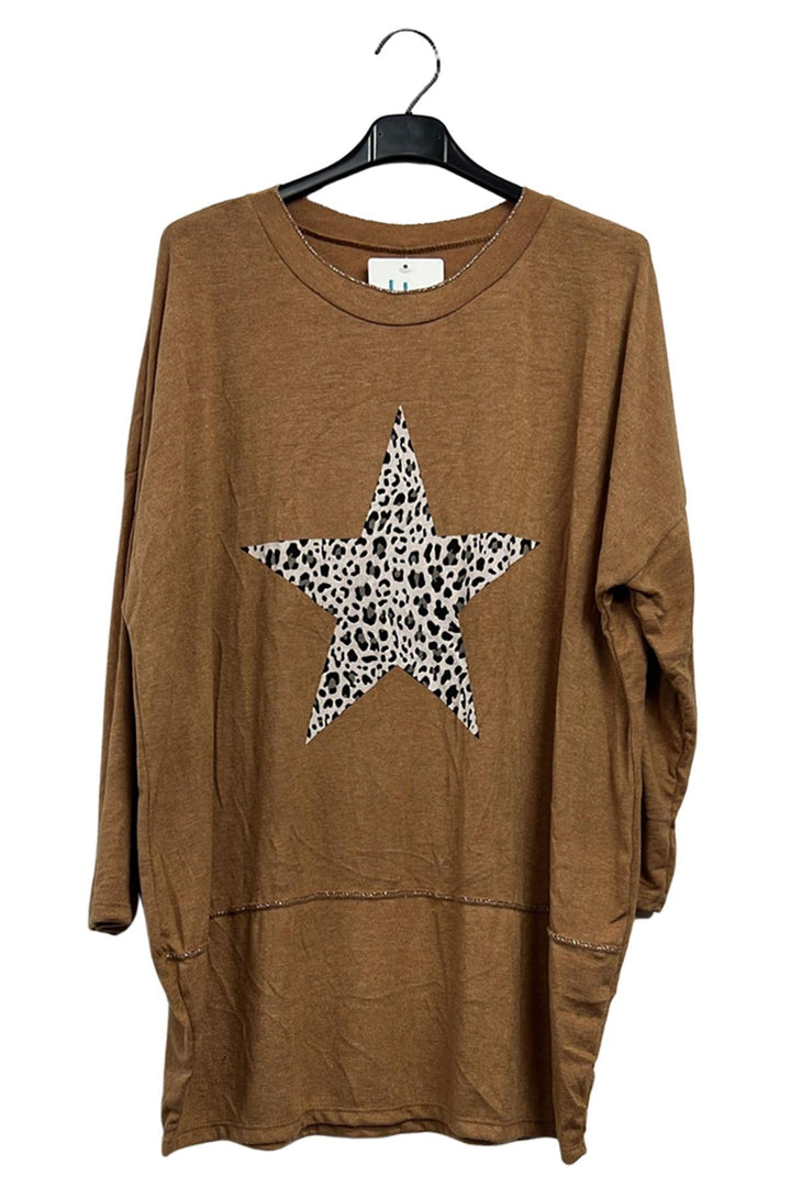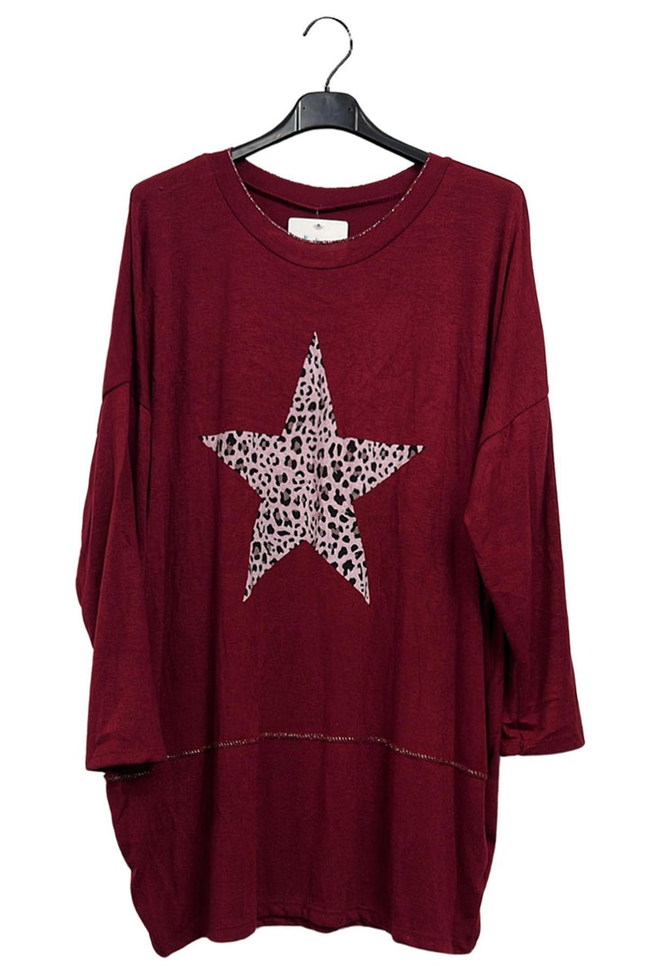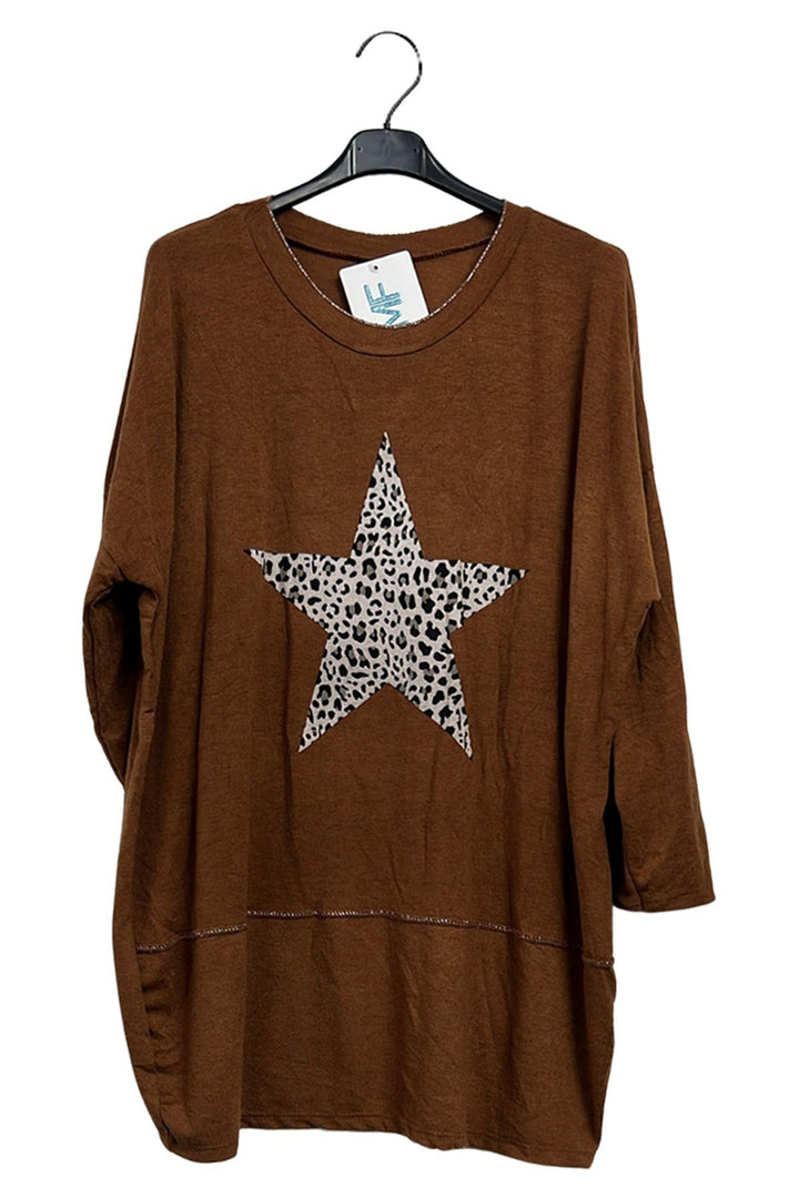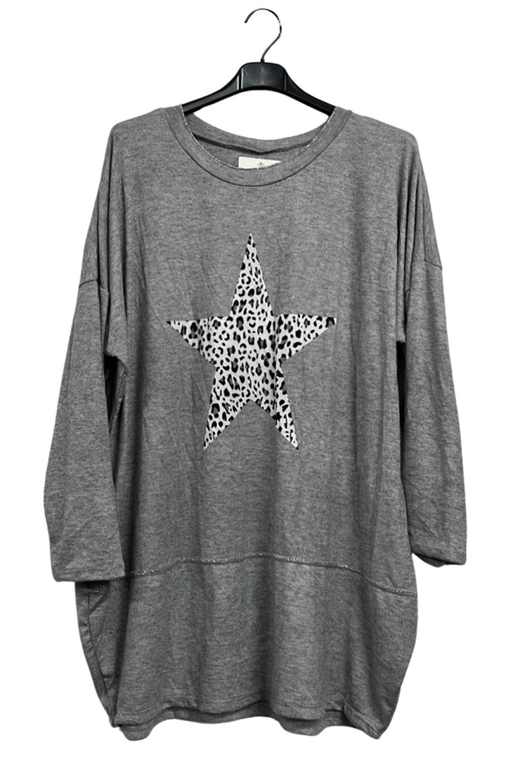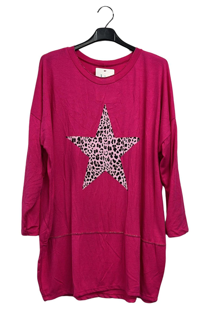 This Italian viscose top blends contemporary charm with cozy comfort, making it a must-have for your autumn-winter wardrobe. Crafted from a lightweight knit fabric, it offers a relaxed, oversized silhouette with a slightly longer length for effortless layering. The round neckline and long sleeves create a timeless look, while the straight hem is accentuated by a visible horizontal seam for added texture. Decorative stitching near the lower part of the top enhances its artisanal feel. The centerpiece is a striking large star graphic in the middle, filled with a bold leopard print that adds a playful edge to the design. Perfect for casual days, this plus-size top pairs beautifully with jeans or leggings, ensuring comfort without compromising style. Whether you’re lounging at home or heading out for coffee, this piece offers everyday wearability with a fashionable twist.