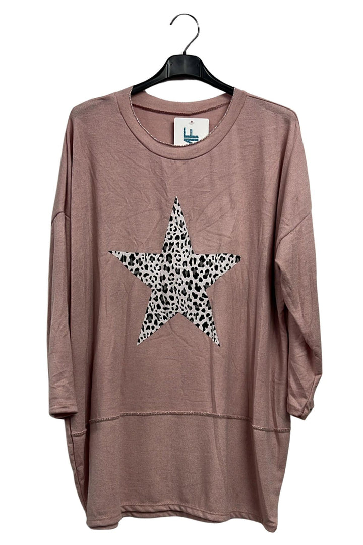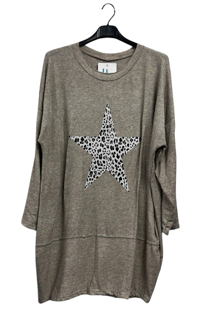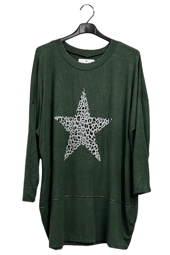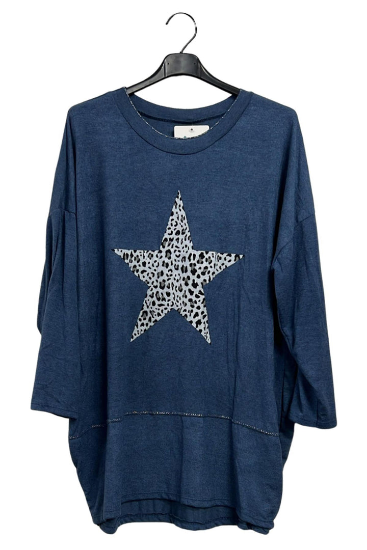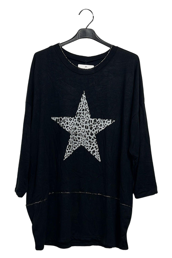 This Italian viscose top blends contemporary charm with cozy comfort, making it a must-have for your autumn-winter wardrobe. Crafted from a lightweight knit fabric, it offers a relaxed, oversized silhouette with a slightly longer length for effortless layering. The round neckline and long sleeves create a timeless look, while the straight hem is accentuated by a visible horizontal seam for added texture. Decorative stitching near the lower part of the top enhances its artisanal feel. The centerpiece is a striking large star graphic in the middle, filled with a bold leopard print that adds a playful edge to the design. Perfect for casual days, this plus-size top pairs beautifully with jeans or leggings, ensuring comfort without compromising style. Whether you’re lounging at home or heading out for coffee, this piece offers everyday wearability with a fashionable twist.