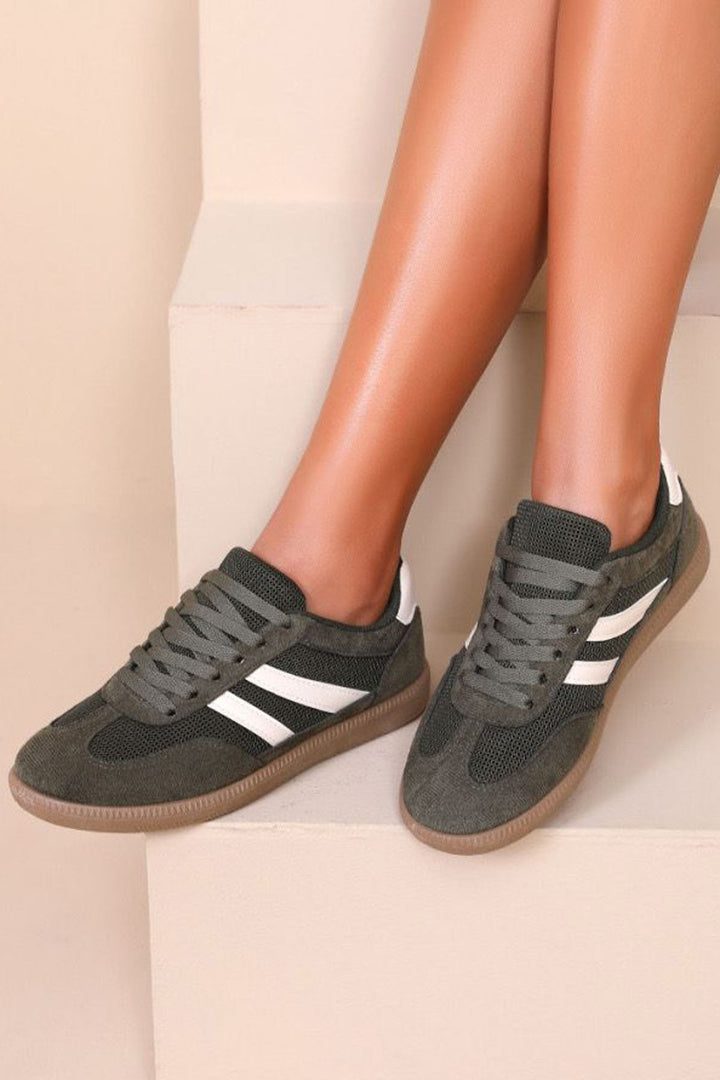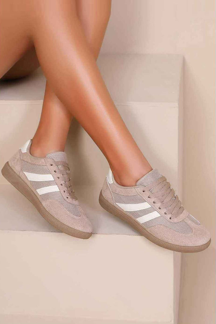 Stay stylish and comfortable all day long with these women’s casual sneakers, designed for both fashion and function. Crafted with a blend of breathable mesh and soft suede panels, these trainers ensure maximum airflow while adding a touch of sophistication to your casual look. The lace-up closure provides a secure and adjustable fit, while the cushioned insole supports your feet for everyday wear. A durable rubber outsole ensures steady traction, making them perfect for walking, light workouts, or casual outings. The neutral beige shade with contrasting white stripes makes them versatile enough to pair with jeans, joggers, dresses, or activewear. Whether you’re heading to the gym, running errands, or going out with friends, these sneakers keep your feet cool, supported, and effortlessly chic.