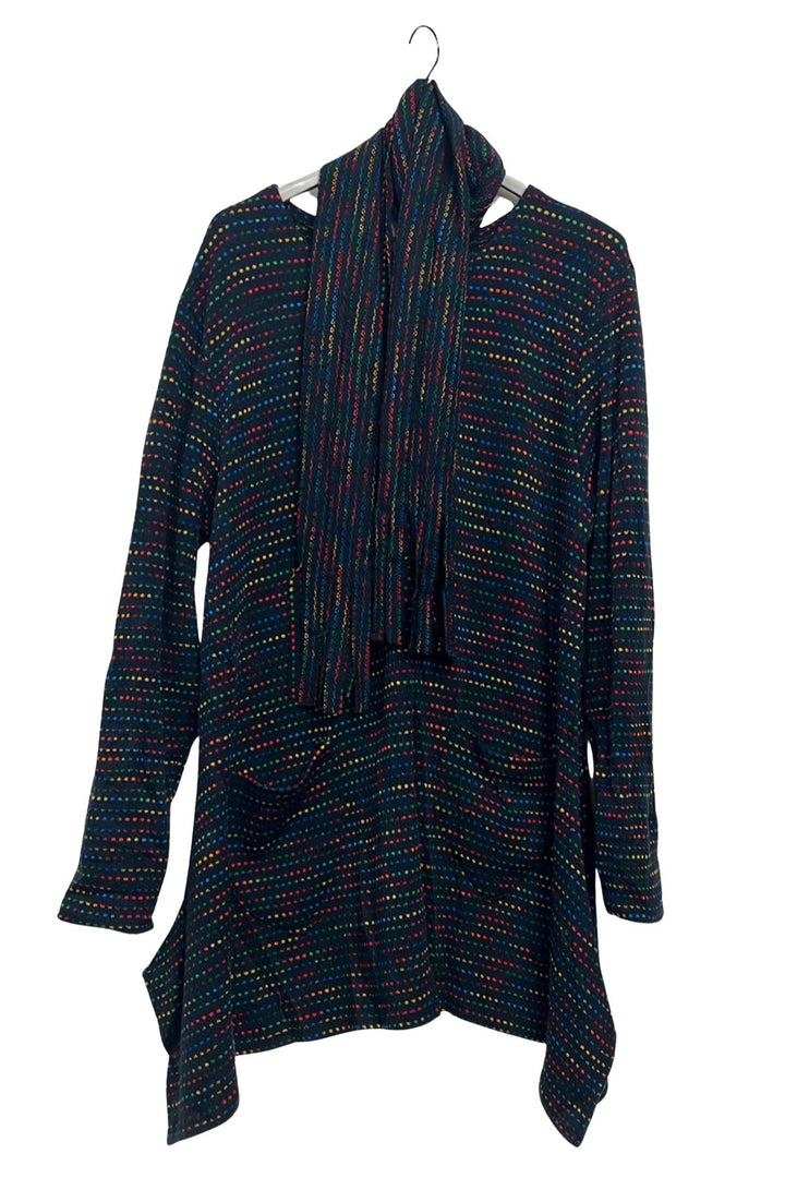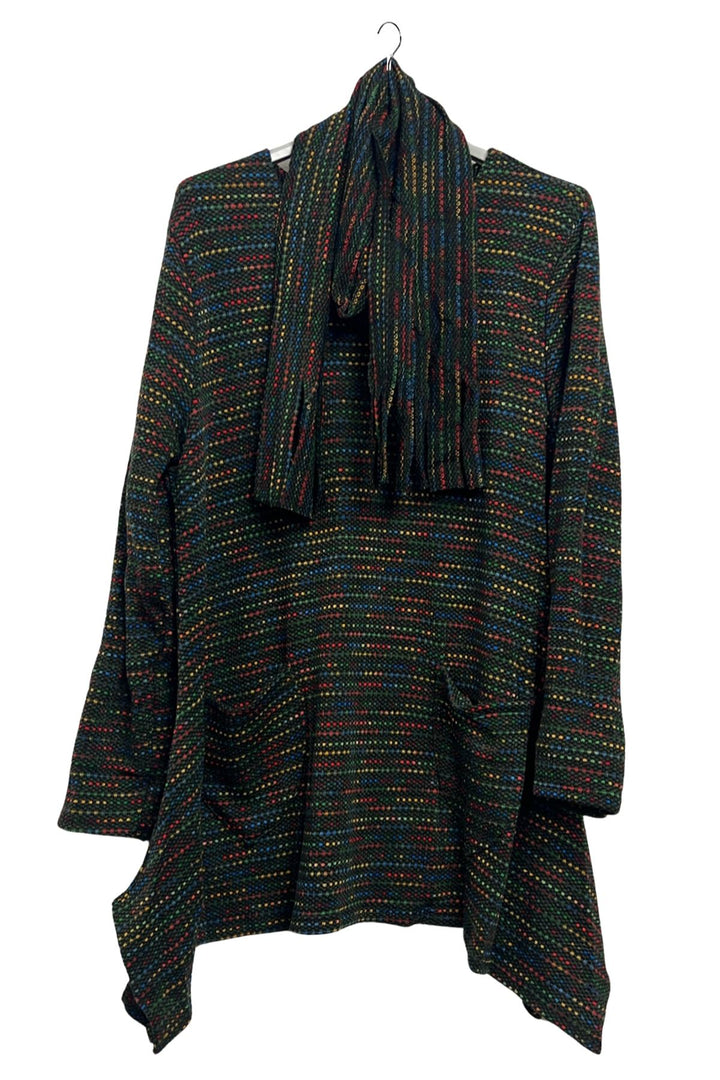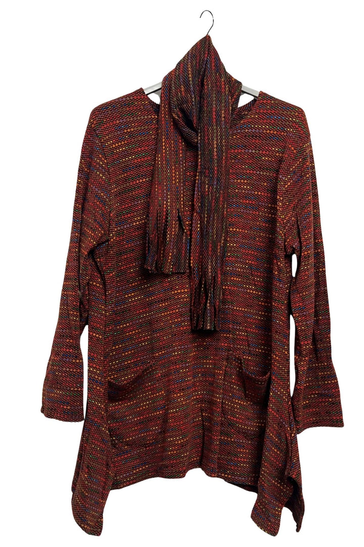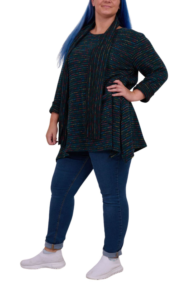 Embrace Italian elegance with this charming jumper for women. Crafted from premium viscose, it features a warm multi-stripe pattern, perfect for autumn-winter. The round neck, long sleeves, and loose fit ensure comfort, while a matching scarf complements the casual style. Plus size, with a pocket detail, this jumper combines fashion and function effortlessly.