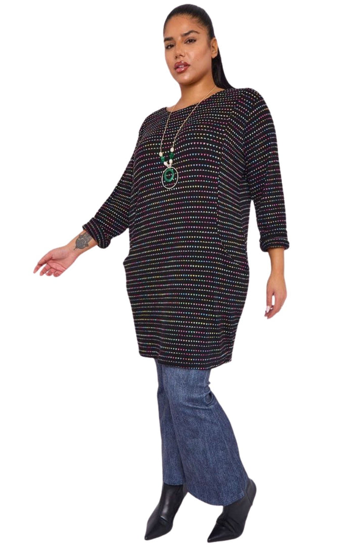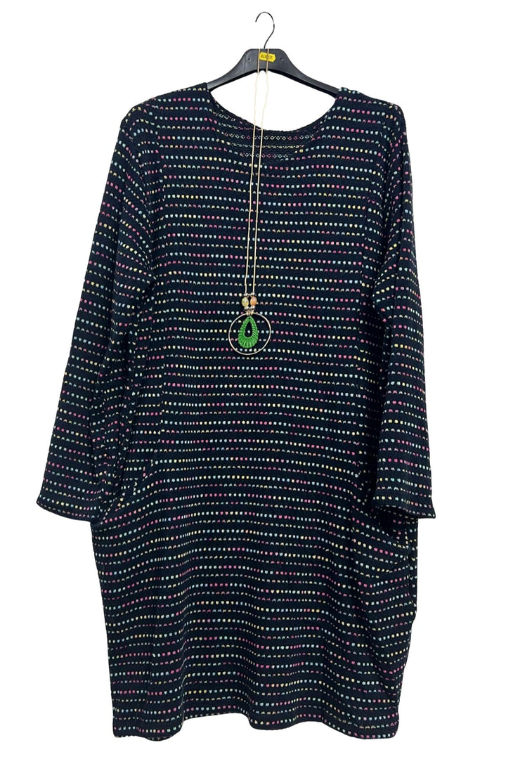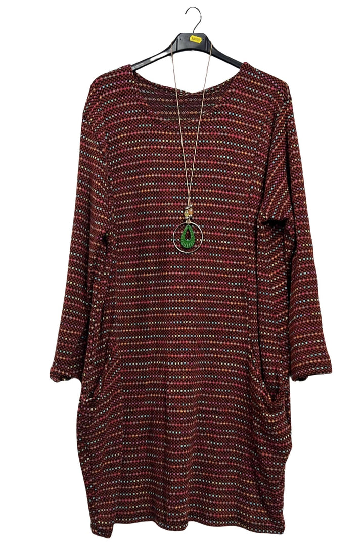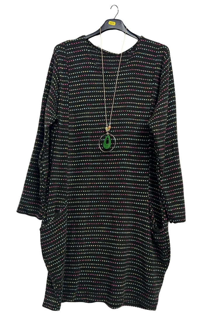 Stay cozy and stylish this autumn and winter with this Italian acrylic dress, featuring vibrant multicoloured stripes that add a playful yet chic touch to your wardrobe. The cowl neck offers extra warmth and a flattering neckline, while the long sleeves provide additional coverage for cooler days. Designed with a loose fit for ultimate comfort, this plus-size dress is perfect for casual outings, whether you’re running errands or meeting friends for coffee. The front pockets add a practical element, while the included necklace gives the outfit an elegant finishing touch. Made from soft, high-quality acrylic, this dress is ideal for layering with tights or leggings, making it a versatile piece for colder months. Pair it with boots and a jacket for a relaxed yet stylish look that effortlessly transitions from day to evening.