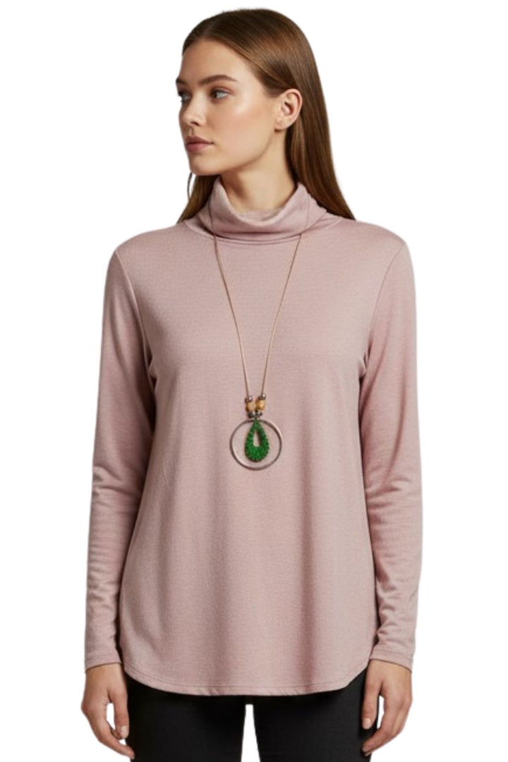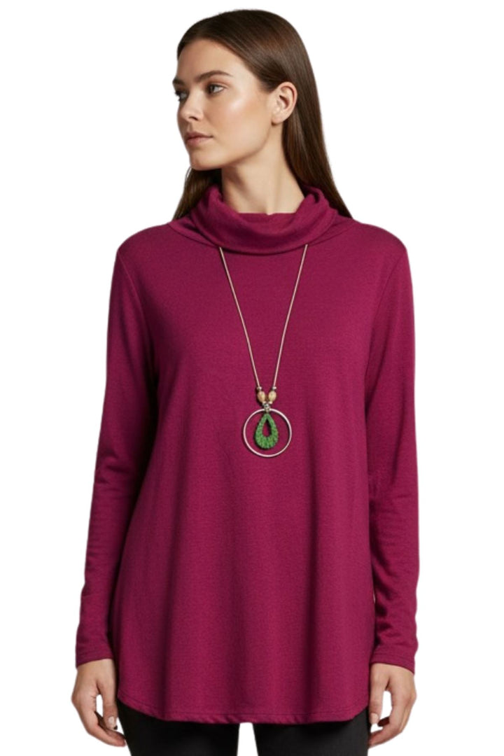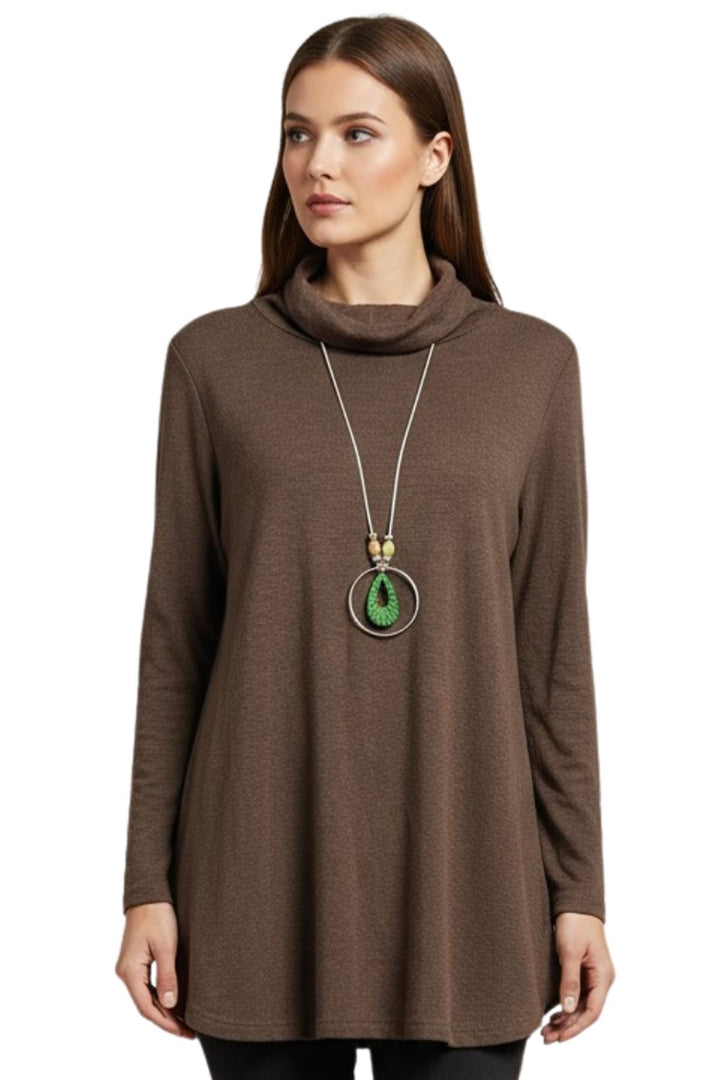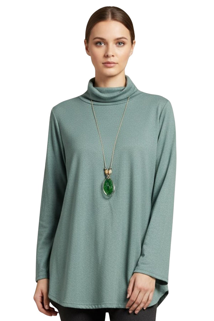 Stay effortlessly chic this season in this Italian Viscose Plain Curved Hem Tunic Top, a perfect blend of elegance and comfort. Crafted from a lightweight soft knit or jersey blend fabric, it features a turtleneck (fold-over collar) that adds a touch of sophistication while keeping you cozy during cooler months. The round curved hemline flatters every figure, while the loose, relaxed fit ensures freedom of movement. Designed with long sleeves and moderate stretch, it offers breathable comfort for layering through fall, winter, or early spring. The look is beautifully finished with a silver-framed green teardrop pendant necklace, adding subtle glamour. Ideal for office casual wear, travel, or everyday outings, this tunic pairs effortlessly with leggings, jeans, or tailored trousers. A timeless Italian-made essential, it combines simplicity and modern style, making it a versatile piece for every woman’s wardrobe.