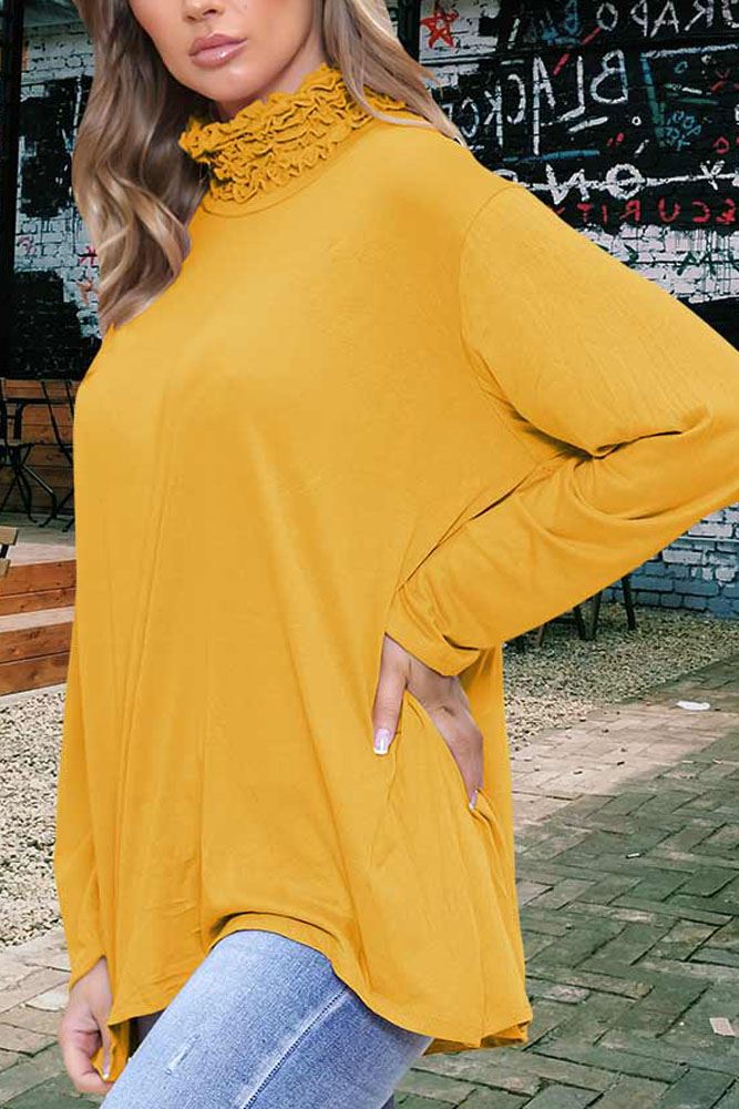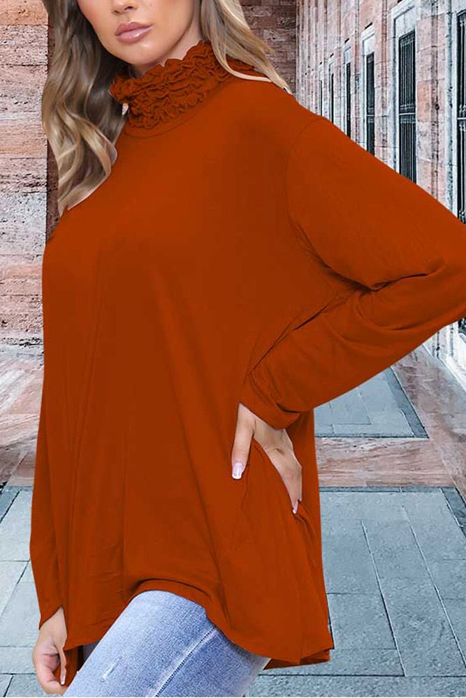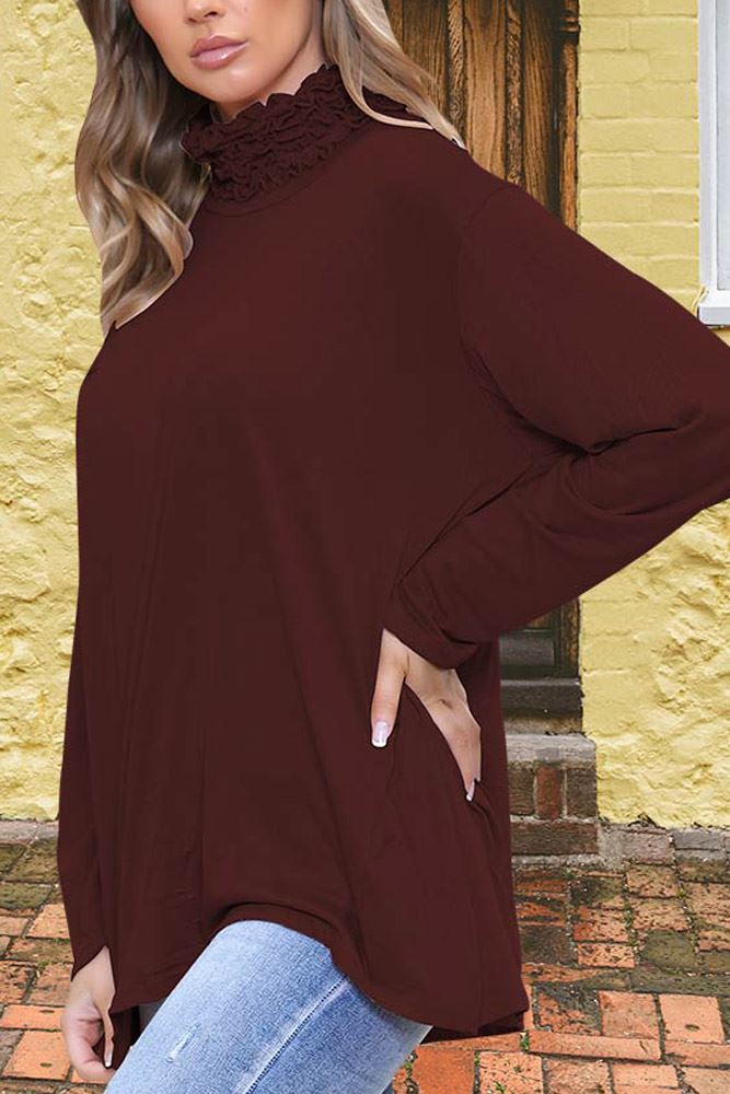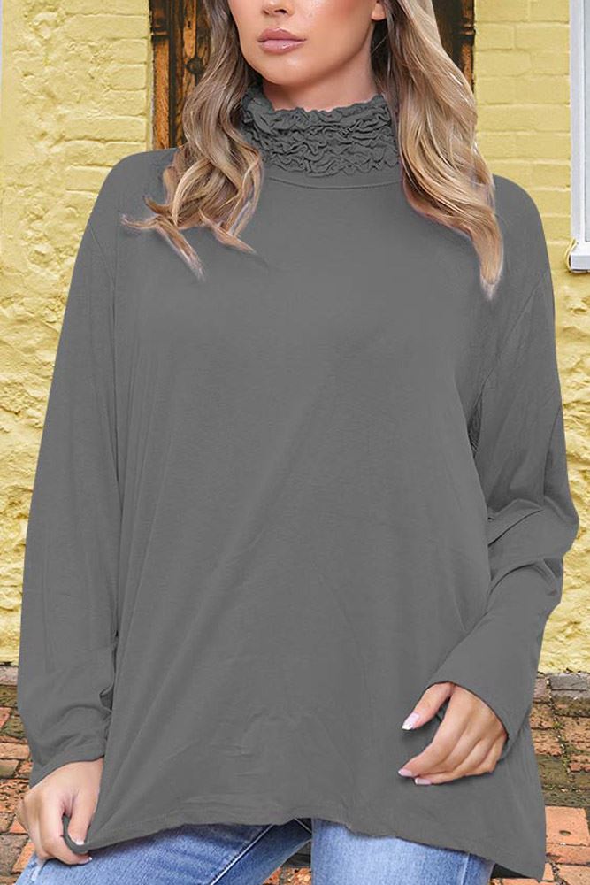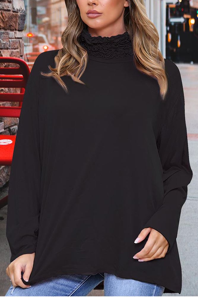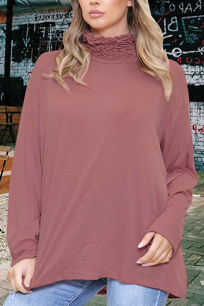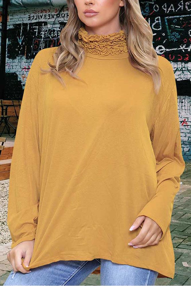 Elevate your autumn-winter style with this Italian-inspired Viscose Ruched Frill Roll Neck Tunic. Its high neck and long sleeves offer warmth and elegance. Plus size and loose fit make it perfect for casual outings, ensuring comfort and style in one versatile top for women.