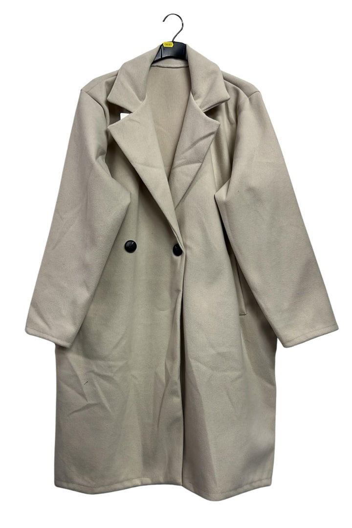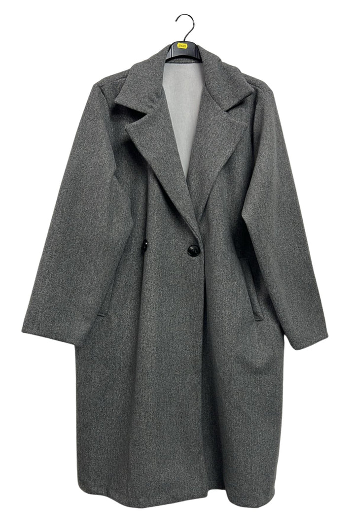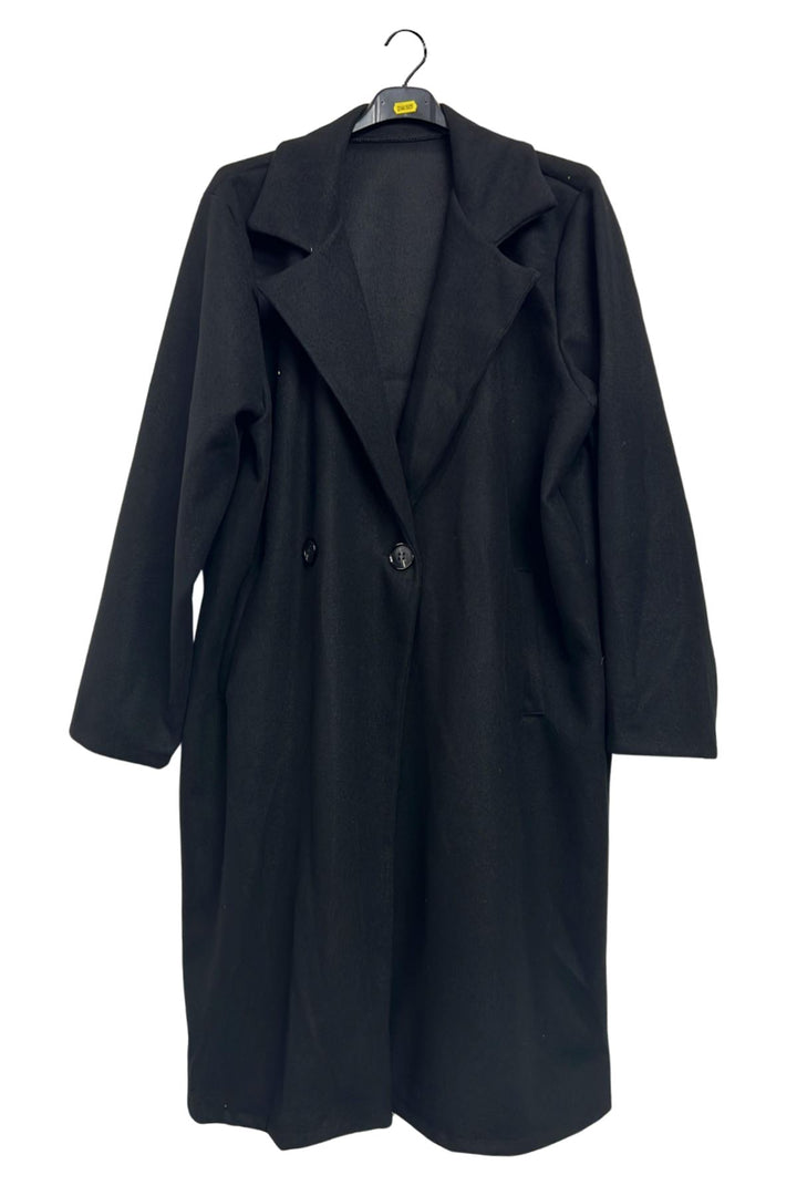 Step into timeless elegance with this Italian viscose classic long overcoat, designed for refined cool-weather dressing. Cut in a relaxed tailored fit, it offers a sophisticated silhouette with effortless layering potential. The double-breasted front is accented by two statement buttons, while a notched lapel collar adds a polished touch. Crafted from a medium- to heavy-weight structured fabric with a wool-blend feel, it provides warmth without bulk. A straight hemline and side slit pockets complete the minimalist design, combining practicality and style. Inside, the coat is fully lined, ensuring comfort and maintaining its clean structure. Perfect for autumn and winter, it transitions seamlessly from work to evening outings. Pair it with tailored trousers for formal occasions or over jeans for chic casual looks. With a plus-size, loose fit, this versatile coat is a wardrobe essential for modern women who value classic, minimalist sophistication.