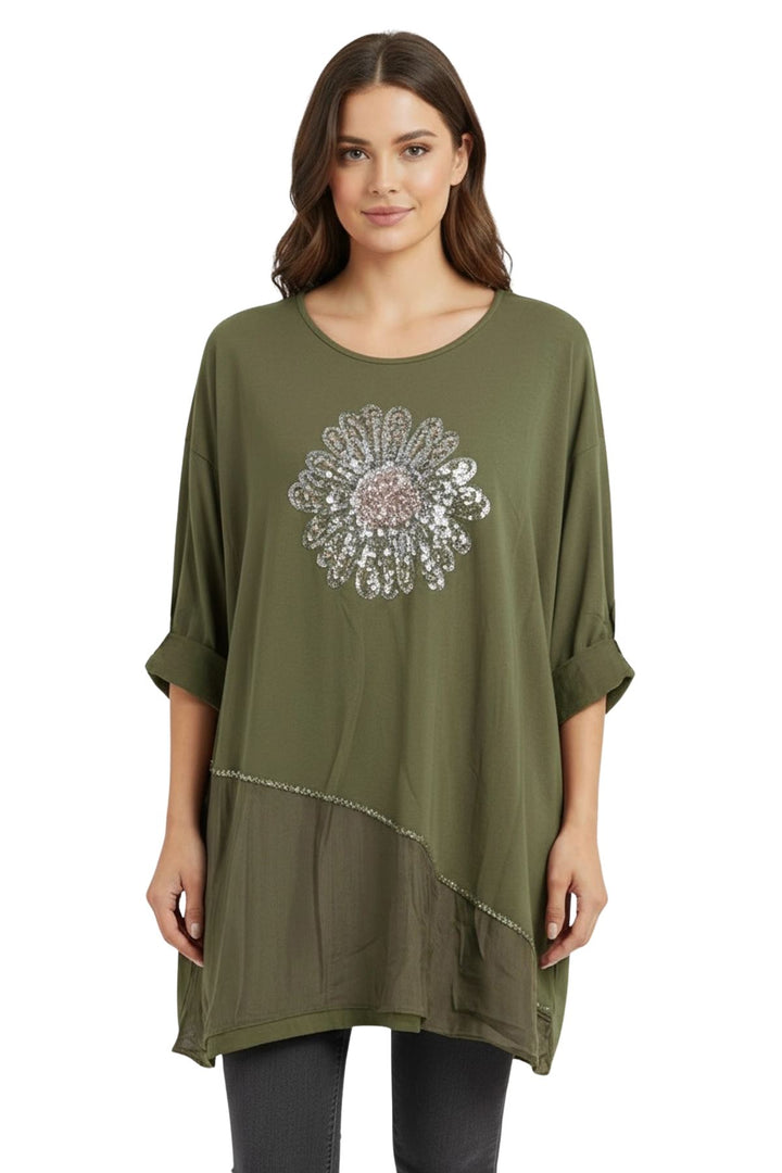Elevate your everyday style with this Italian cotton oversized top, featuring a stunning sequin floral motif that adds a touch of glamour to casual comfort. Crafted from a lightweight cotton blend, the fabric feels soft, breathable, and slightly stretchy for easy movement. The relaxed silhouette with dropped shoulders and long sleeves offers a flowy fit that flatters every body type. A round neckline and straight hemline create a timeless shape, while the silk-like contrast panel at the hem adds modern sophistication with a subtle shimmer. The large floral embellishment on the front, designed with golden and silver sequins, catches the light beautifully for a chic, eye-catching effect. Ideal for layering during autumn and winter, this plus-size top combines comfort and style effortlessly. Pair it with leggings, jeans, or tailored pants for a relaxed yet polished look—perfect for casual outings, travel, or cozy evenings.