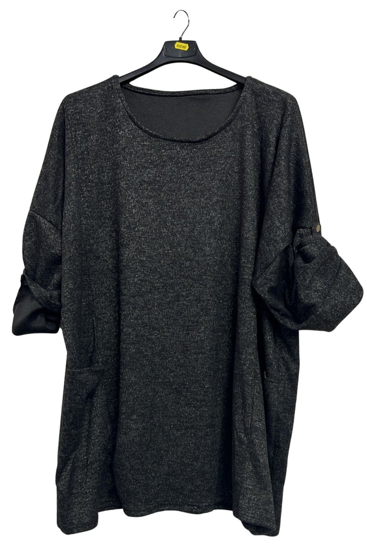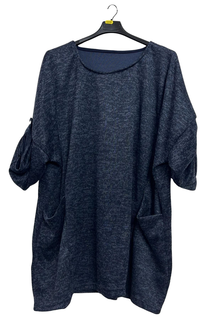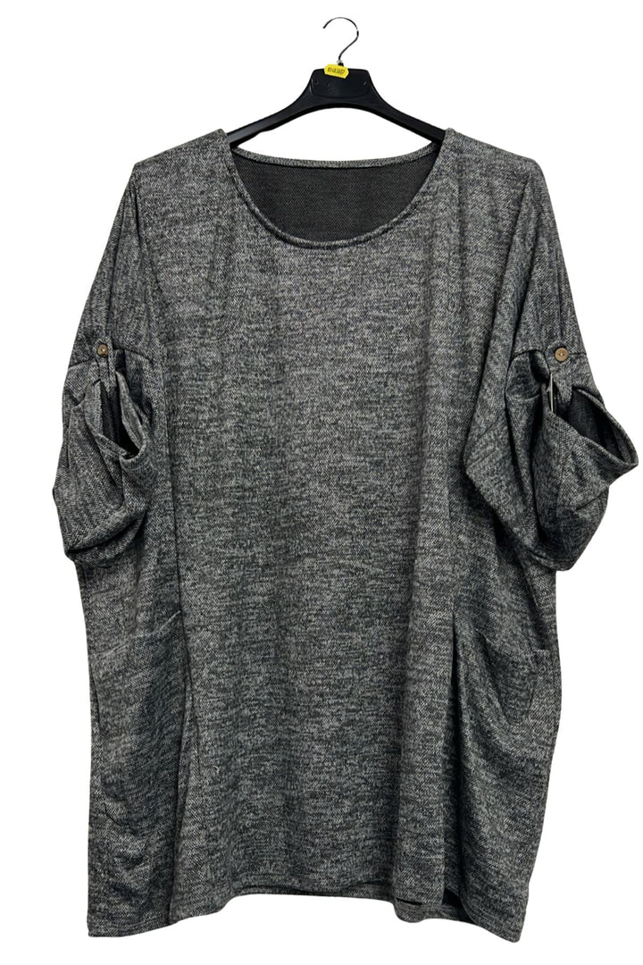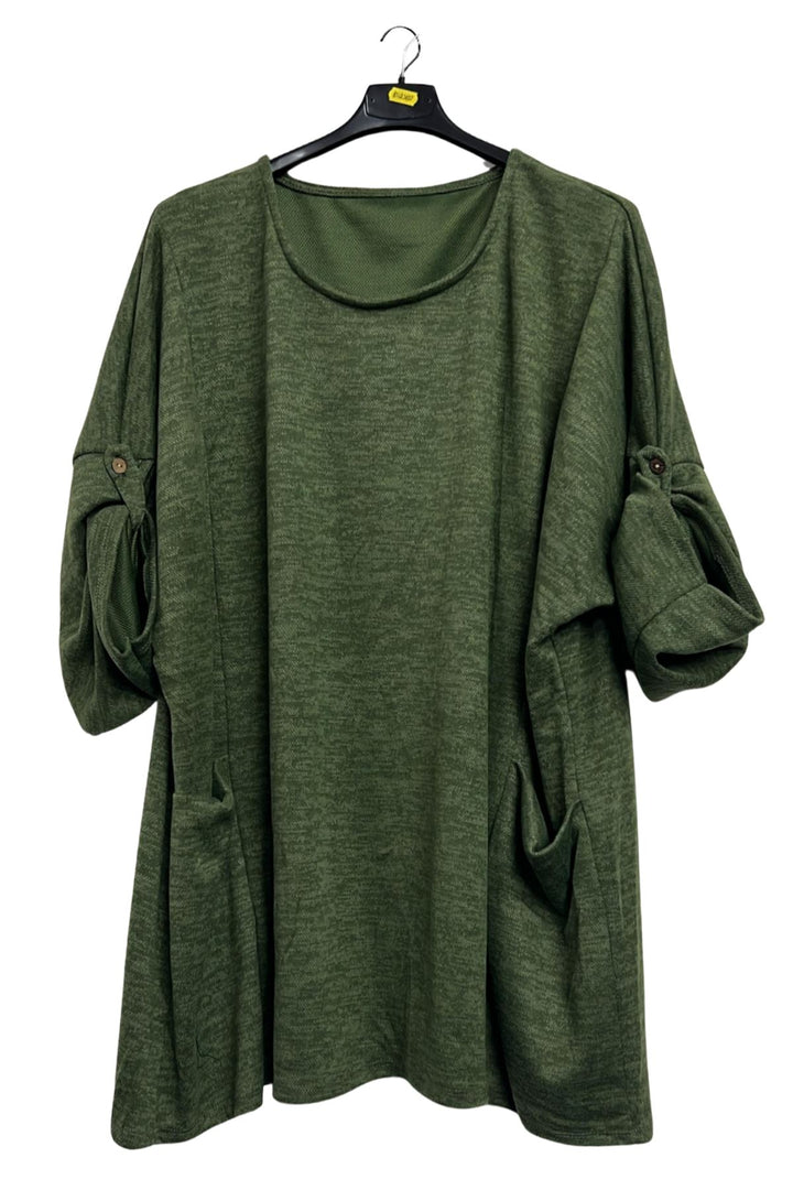 Elevate your casual wardrobe with this Italian polyester oversized tunic top, designed for effortless comfort and style. Made from soft, breathable fabric with a subtle heathered texture, it feels cozy yet light—perfect for autumn, winter, or spring layering. The relaxed, plus-size fit features dropped shoulders and 3/4 length sleeves with a tab and button detail, gently gathered into a charming bow effect. Two large draped front pockets add both practicality and graceful movement, while the straight hemline flares slightly for a flattering drape. The solid colour, enhanced by its textured finish, creates a refined, understated look that transitions easily from home to outings or travel. Pair it with leggings, skinny jeans, or tailored trousers for versatile styling. Whether you’re running errands, meeting friends, or enjoying a weekend getaway, this tunic combines Italian craftsmanship with everyday functionality, making it an essential piece for a modern, relaxed wardrobe.
