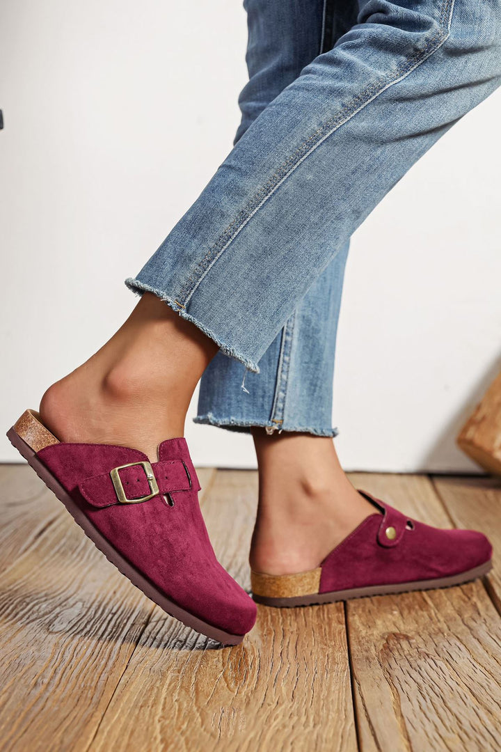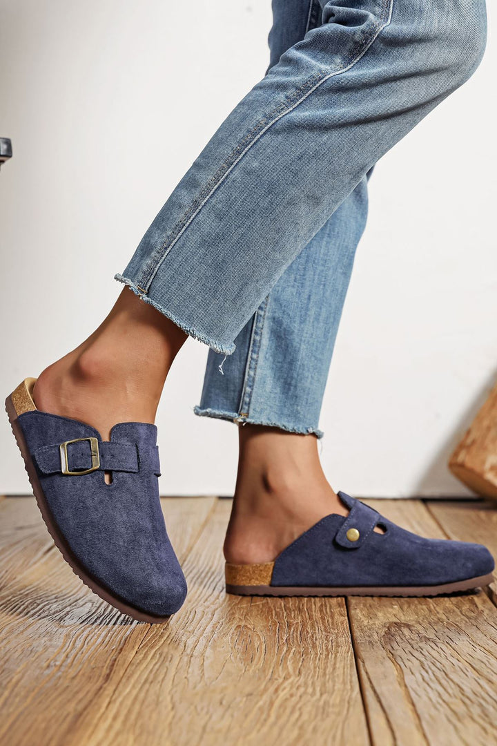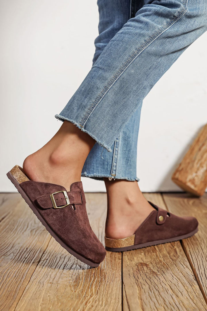 Step into effortless comfort and timeless style with these women’s slip-on clogs. Designed with a soft suede upper, they offer a chic yet casual look that pairs perfectly with everyday outfits. The adjustable buckle strap ensures a secure fit, while the rounded closed-toe design provides both coverage and comfort. Featuring a contoured cork footbed, these clogs support natural foot alignment and keep your feet comfortable throughout the day. The lightweight rubber sole offers excellent grip, making them suitable for indoor lounging, casual outings, or travel. Versatile and durable, these mules are a wardrobe essential for those who value both fashion and practicality. Whether worn with jeans, skirts, or loungewear, they bring relaxed sophistication to any outfit.